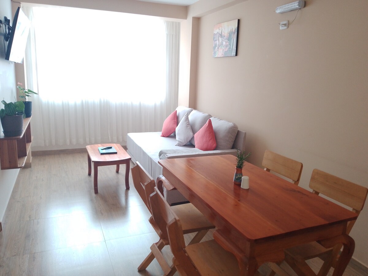 Dette vakre Airbnb-utleiestedet tilbyr en hel toetasjes leilighet, romslig og svært koselig, med ett soverom med kingsize-seng for en god natts søvn og et eget bad. Den har svært god belysning og ventilasjon og ligger i fjerde etasje med tilgang via trapp. Den har områder som stue, spisestue, fullt utstyrt kjøkken med kjøkkenøy, terrasse med vakker utsikt og vaskerom. Det ligger i et sentralt område, i nærheten av bussterminalen, butikker, markeder og Plaza de Armas, noe som gjør det til et utmerket utgangspunkt for å besøke turistattraksjoner.