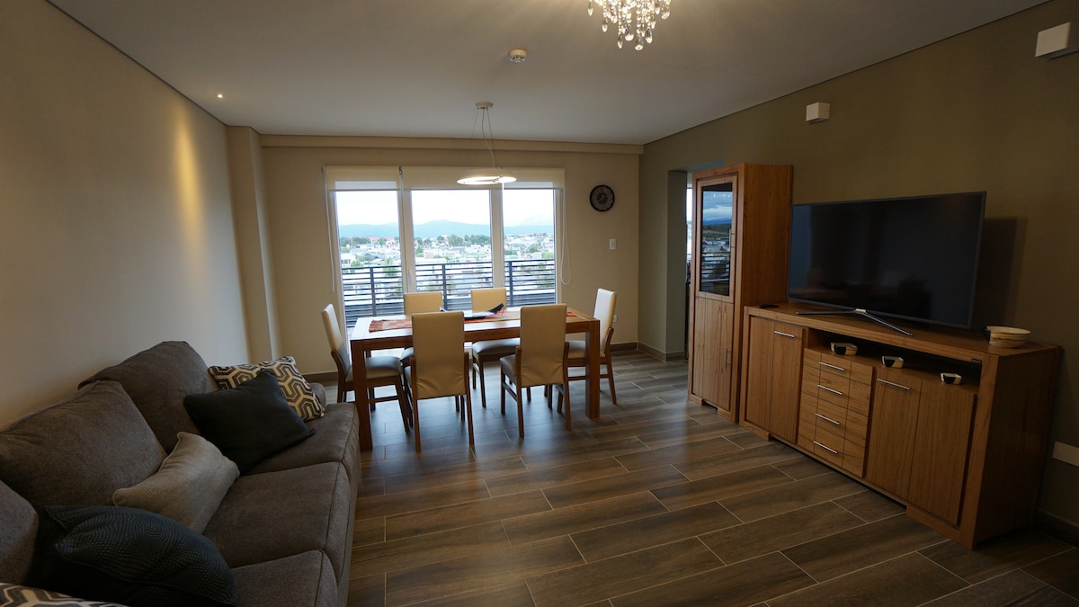 Ny leilighet for 2 personer (40 m2). Meget lyst, stille og koselig, med regulerbart sentralvarme, vakker utsikt over byen, Beagle-kanalen og fjellene. Ligger 15 minutter å gå eller 5 minutter med bil/taxi fra sentrum (Avenida San Martín), og 15 minutter med bil/taxi fra Malvinas Argentinas internasjonale flyplass. **Viktig avklaring** BYGNINGEN HAR IKKE HEIS – Du må gå opp to etasjer med trapp.
