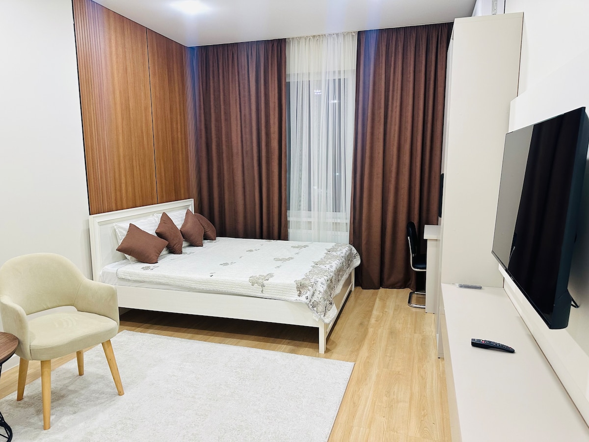 Romslig hjørneleilighet i hjertet av Tasjkent med panoramavinduer og fantastisk utsikt over Tasjkent by. Stilig, moderne interiør, møbler av høy kvalitet, gjennomtenkte detaljer for din bekvemmelighet. Plass til opptil fire gjester. Gangavstand til Magic City, Seoul Mun, Tashkent City Mall, Tashkent City Park, restauranter, kafeer, Chorsu og hovedattraksjoner. Perfekt for ferier, romantiske turer og forretningsmøter.
