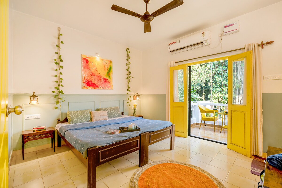 Walk through a charming lane lined with old Goan villas which leads you to a bright and cozy one-bedroom apartment. Just a relaxed five-minute walk from the beach. The sun-filled bedroom with a king-size bed overlooks lush greenery, while air-conditioning keeps you cool after warm summer days. A private balcony shaded by a majestic banyan tree offers the perfect spot for slow mornings and quiet evenings. The comfortable living area adds a warm, artistic touch to this calm coastal retreat.