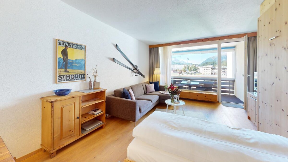 Leiligheten ligger i hjertet av det verdensberømte feriestedet St. Moritz, bare 7 minutters gange fra fjellbanen.Den er 30 m2 stor og har blitt moderne renovert med treverk.Nyt solen på terrassen. En stor dobbeltseng, privat underjordisk parkeringsplass, moderne bad, spiseplass, raskt internett, smarthøyttaler, Frame TV med Netflix og et fullt utstyrt kjøkkenområde sørger for et perfekt opphold.Svømmebasseng, badstue og treningsstudio tilgjengelig i høysesongen.