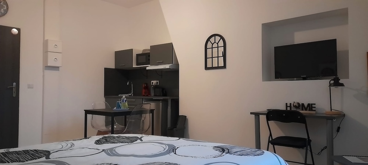 🏡 Koselig studioleilighet på 22 m² med privat terrasse og hage 🌿 – et sjeldent funn i byen! Nyt solfylte stunder ☀️☕ 🛏️ Dobbeltseng + to sovesofaer 🍽️ Fullt utstyrt kjøkken (stekeovn, mikrobølgeovn) Trådløst nettverk 📶 med høy hastighet. 🚲 Sikker sykkelskur 🚋 Trikken ligger kun to minutter unna for å komme deg til sentrum og togstasjonen 🚉 Et rolig, funksjonelt og optimalisert sted – perfekt for oppholdet ditt i Valenciennes!