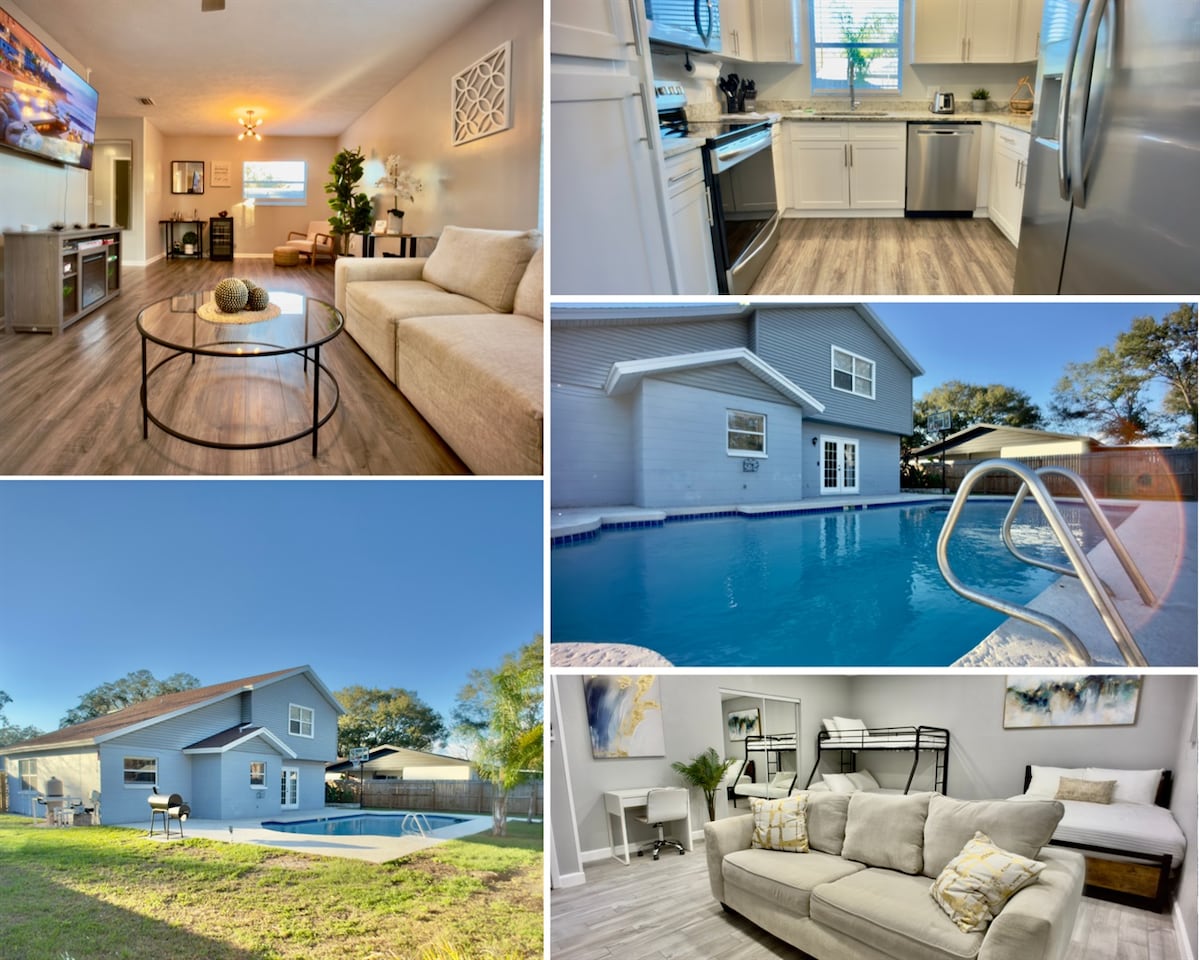 ✨ Newly heated pool + basketball court + BBQ — this 4BR/2.5BA Valrico retreat is built for fun. Sleeps 12 across spacious bedrooms with a fully equipped kitchen, smart TVs, and a fenced backyard paradise. Pet-friendly with private driveway parking. Just 12 min to Brandon Mall, 30 min to Busch Gardens & downtown Tampa. Superhost-managed with 6,500+ five-star reviews across 90+ homes. Your group vacation starts here.