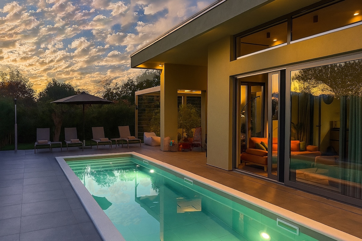 Discover the epitome of privacy, tranquility and relaxation in our new designer Villa Bella Nicole, nestled in the serene village of Bale, 10 km from Rovigno – Istria. Enjoy a private 10-meter heated pool. Nearby are grocery stores, restaurants, and a pharmacy. Pristine beaches are just 9 km away with free Camp Mon Perin guest cards and free parking 50 m from the beach. Free beach entrance.