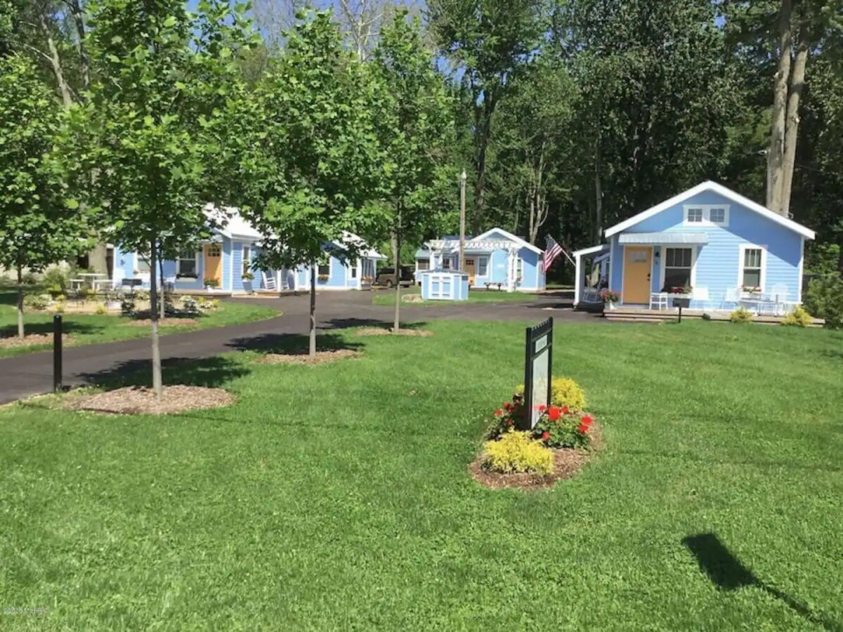 Velkommen til «Ontario», en av seks hytter på «The Herons Nest». Denne sjarmerende hytta med ett soverom og ett bad, som har plass til fem personer, har buede tak og et bedårende loft med en Twin XL-plattformseng. Den koselige stuen har en sovesofa i full størrelse. Hver hytte er utstyrt med et fullt kjøkken, inkludert kjøleskap, mikrobølgeovn, oppvaskmaskin og komfyr. Gå inn for å finne vakre hickory tregulv, moderne flislagte bad og din egen private terrasse med grill for utendørs spising.