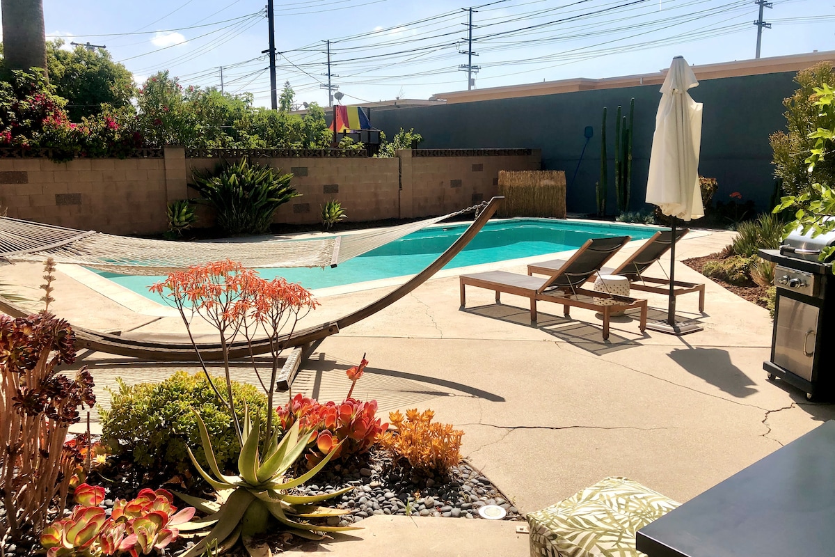 Slapp av i studio-gjestehuset vårt, bortgjemt i en fredelig bakgård med et stort privat basseng, cabana, massasjestol og boblebad. Fordyp deg i paradis, omgitt av tropiske frukttrær, en økologisk hage og et akvaponisk system. Utendørs lykke venter for 420 entusiaster (kun utendørs). Nevn «420-vennlig» når du bestiller for å motta en gave av vår hjemmedyrkede, plantevernmiddelfrie cannabis. Maks to gjester, ingen unntak. Vennligst se gjennom beskrivelsen og husreglene våre før du bestiller.