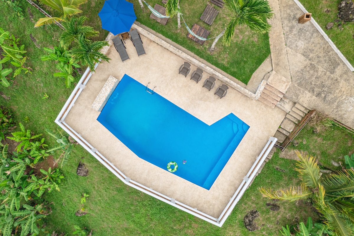 Utsikt over havet, byen og regnskogen | basseng og bålplass