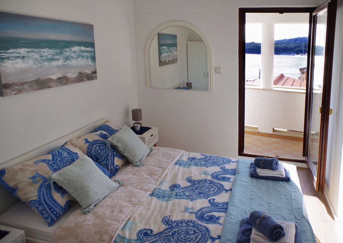 Denne eiendommen ligger rett ved sjøen. Nyt komforten i leiligheten vår. Den er romslig, og du kan gå barbeint på tregulvet. Etter en tidlig morgensvømmetur kan du nyte en kaffe på balkongen vår eller i stuen vår, begge med utrolig utsikt over havet. Se på regattaene, fantastiske solnedganger, og med litt flaks til og med delfiner. Ta en grillkveld i hagen/grillområdet vårt i skyggen av vinrankene, eller bare ta en av syklene våre og ta en fin sykkeltur.