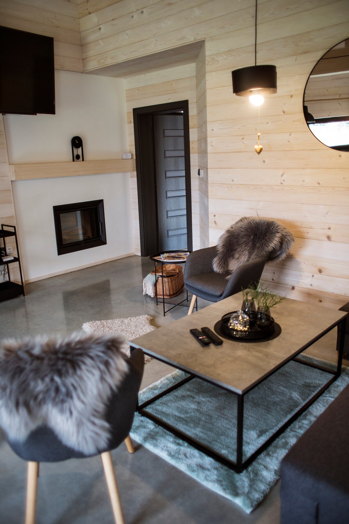 Trehytta vår ligger mellom to elver. Så det er et fantastisk og veldig fredelig sted å bo. Nede er det et hovedrom, med moderne kjøkken, kjøleskap, vaskemaskin, oppvaskmaskin ... det er en peis, som kan varme hele hytta. Den store terrassen er et flott sted hvor du kan nyte en kopp te eller kaffe. Hagen og omgivelsene er et veldig flott sted for barn. Og hvis været blir dårlig, vil de kanskje bli glade for å svinge lavt i hytta … :-)