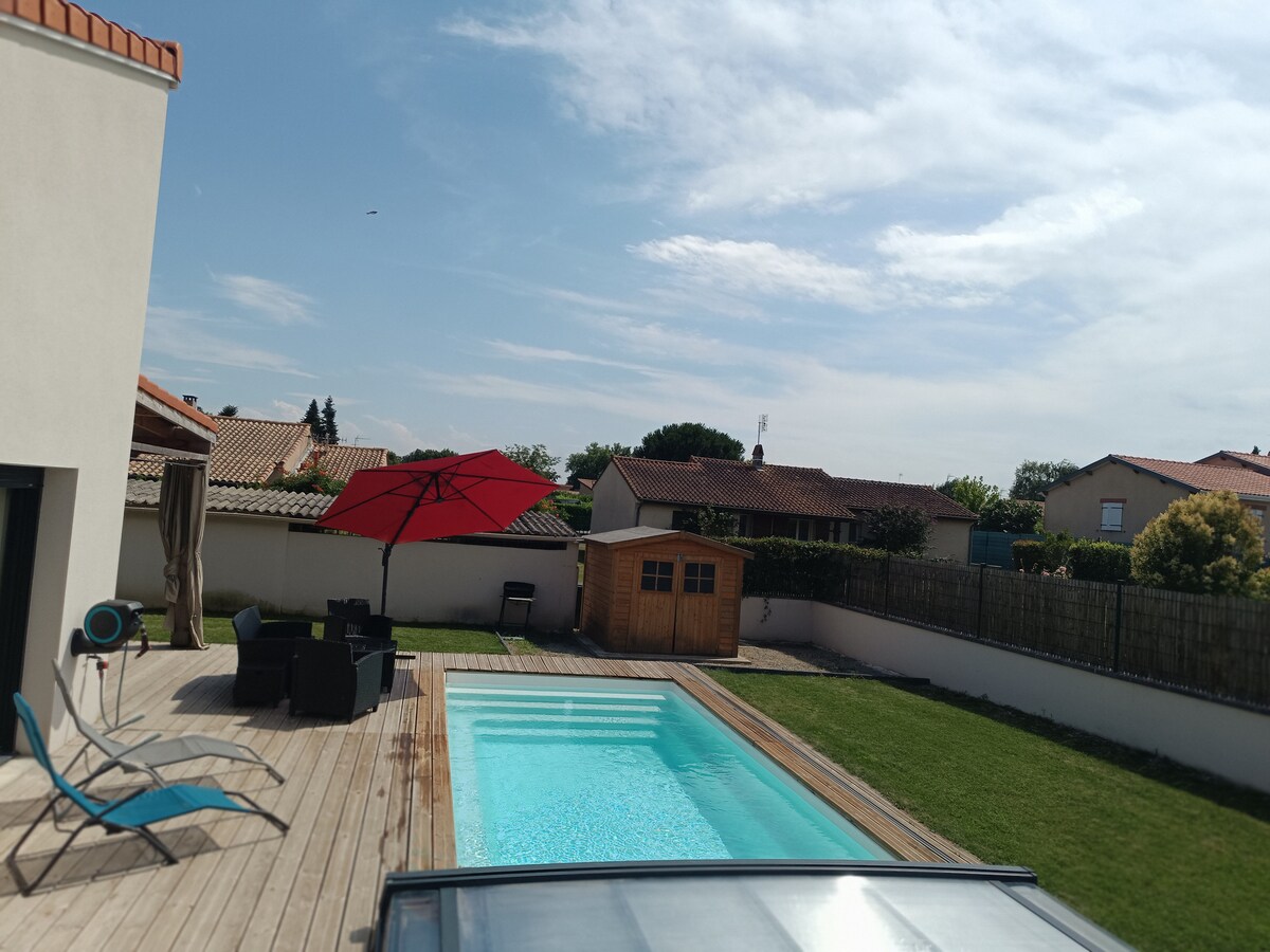 Sjarmerende villa på 60 kvm, ideell med tilgang til basseng og utendørs terrasse bare 20 minutter fra Toulouse. Ideell for en familie på to voksne og to eller tre barn. Dette huset har også plass til komfortabelt 4 voksne. Som par får du et sjenerøst og hyggelig sted. Gratis privat parkering, butikker, restauranter i nærheten. Håndklær og sengetøy er tilgjengelig.
