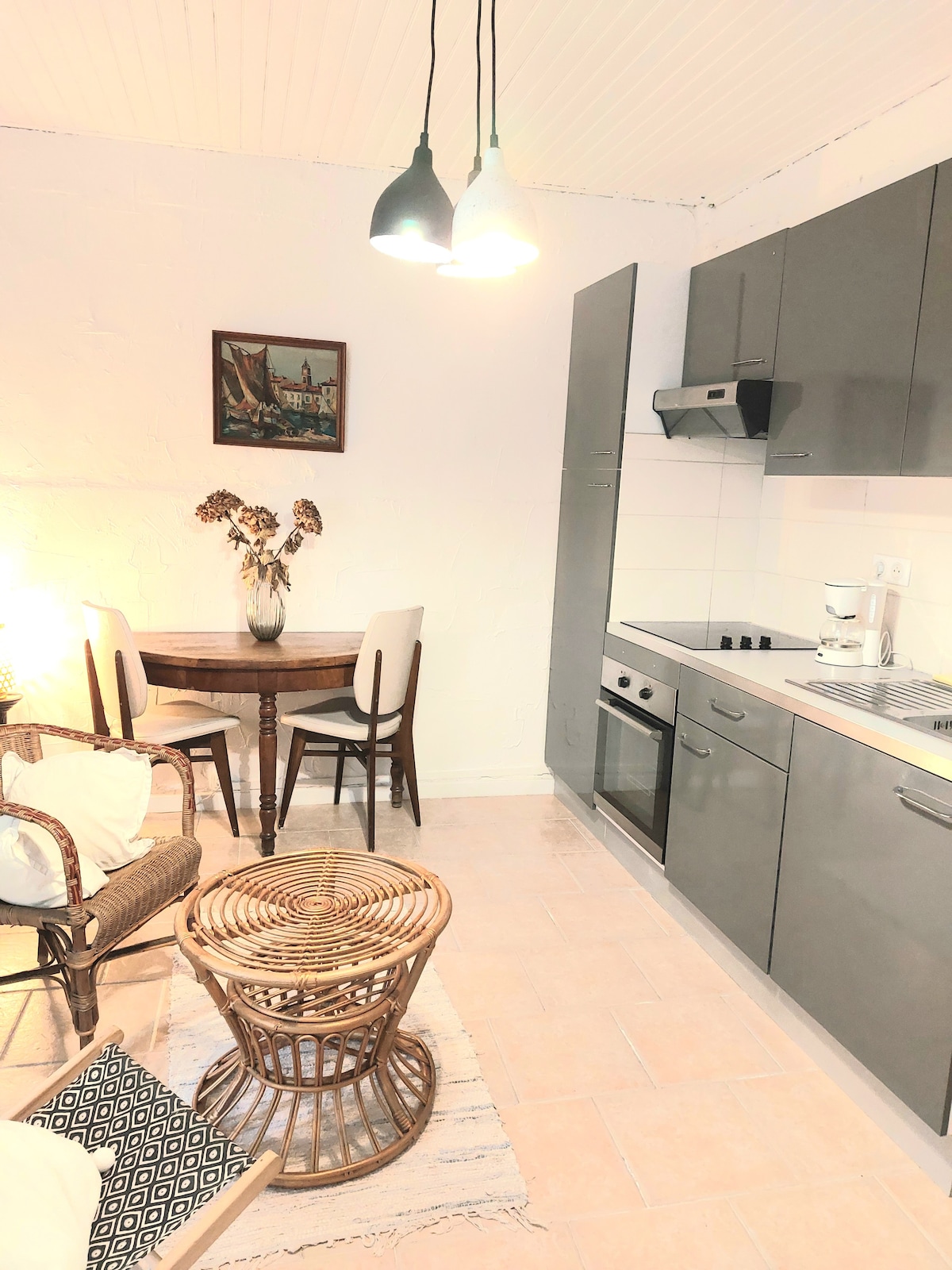 To rom på 50 m2 i første etasje i et rolig område, inkludert et soverom med dobbeltseng, stue med sovesofa, dusjrom, kjøkken og terrasse. 5 minutter gangavstand fra stranden og 1 km fra elven. Du kan også besøke en gammel oljemølle og fottur.