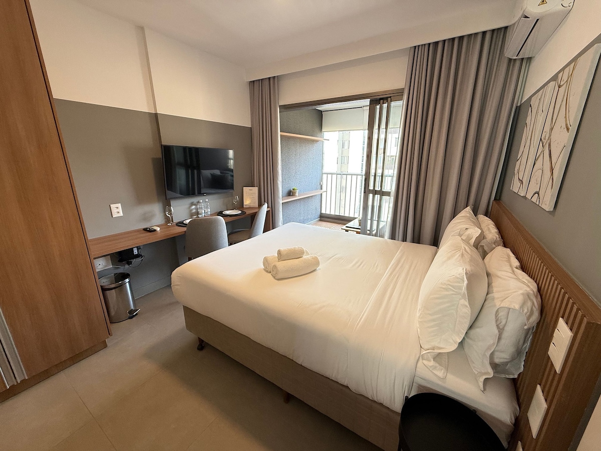 Opplev One Eleven i Vila Olimpia. Denne moderne leiligheten har store vinduer med fantastisk utsikt over byen og naturlig lys. Enheten har 600 Mbps trådløst nettverk og en 4K HD-TV. For total komfort har den et varmt/kaldt klimaanlegg: 27 000 BTU/t enhet i stuen og 10 000 BTU/t på soverommet. Soverommet er rolig og mørkt for en avslappende søvn. Upåklagelig vedlikeholdt, du er i gangavstand til de beste restaurantene og forretningsområdene – et trygt, eksklusivt tilfluktssted med en fantastisk urban bakgrunn.
