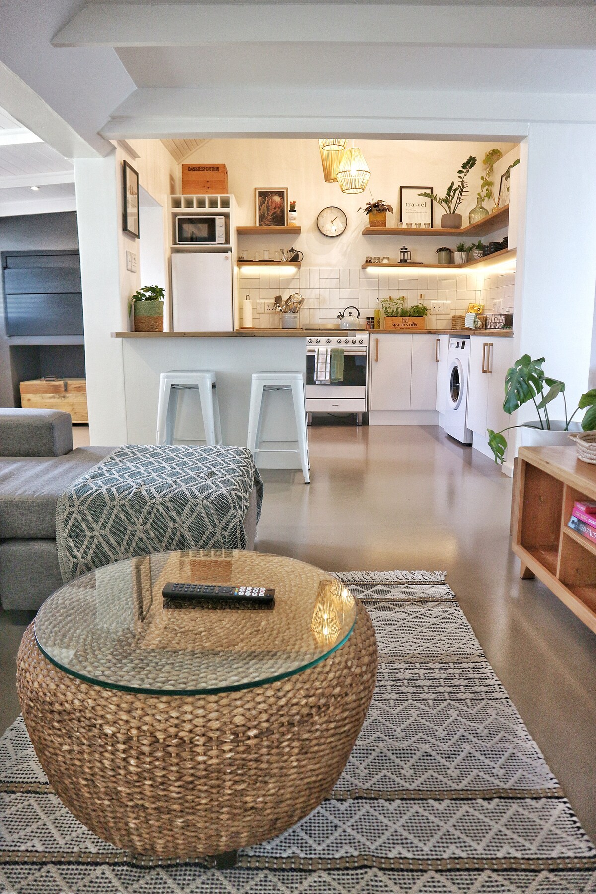 Hyggelig og lett to-roms hytte på området til et av de opprinnelige gamle husene i Onrus – omgitt av lokale kafeer og restauranter. Du befinner deg i et travelt lite nabolag, bortskjemt med valgmuligheter med alle de lokale spisestedene, kaffebarene og delikatessene – beleilig plassert med åtte minutters gange til hovedstranden. Kjøkkenet og stuen er åpen planlagt med peis og en utendørs braai på den overbygde verandaen. Egnet for to par, enslige reisende eller en liten familie.