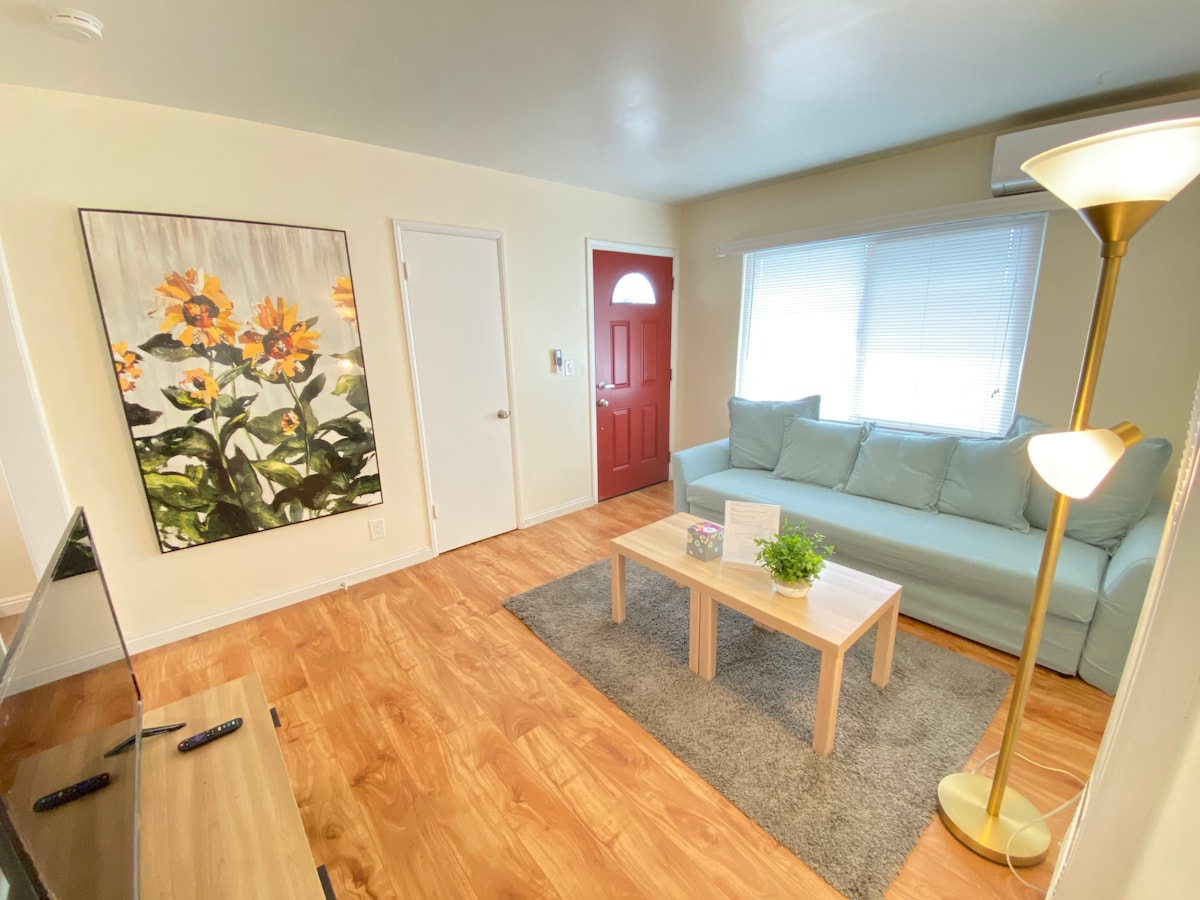Nyt dette private, nyoppussede og lyse hjemmet. Dette romslige hjemmet ligger i et trygt og rolig nabolag og er perfekt for en stor gruppe. Det er to lyse og komfortable soverom, én kingsize- og én queen-madrass. Det er en dobbeltseng i stuen og to sammenleggbare enkeltsenger. 🚙 35 minutter til LAX. * Privat inngang med nøkkelkode. * Privat tilgang til vaskemaskin/tørketrommel. * Komplett kjøkken. * Raskt trådløst nettverk. * Klimaanlegg på hvert soverom. ❄️ * Bidé. * Elbillader på nivå 1.