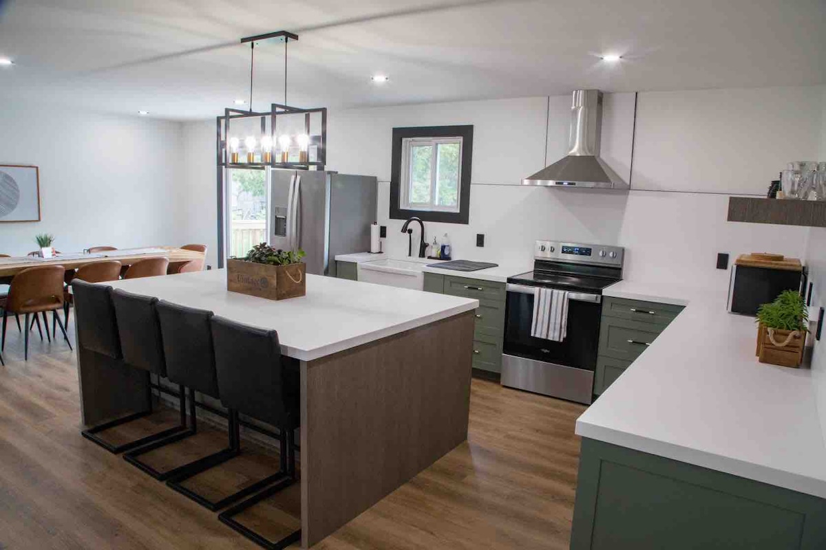 Eh Frame er en treetasjes, skandinavisk-inspirert luksushytte med to helt separate enheter: Sunrise og Sunset-suiter. Gruppen din har eksklusiv tilgang til Sunrise-suiten (alt som vises på bildene), inkludert to soverom, en terrasse, et privat spa og en bålplass. Den fremre enheten, Sunset Suite, er en separat leieenhet. En full brannmur går gjennom midten av hjemmet, noe som sikrer privatliv og komfort for alle gjester. Ligger bare noen minutter unna Whispering Springs og Ste. Annes Spa.