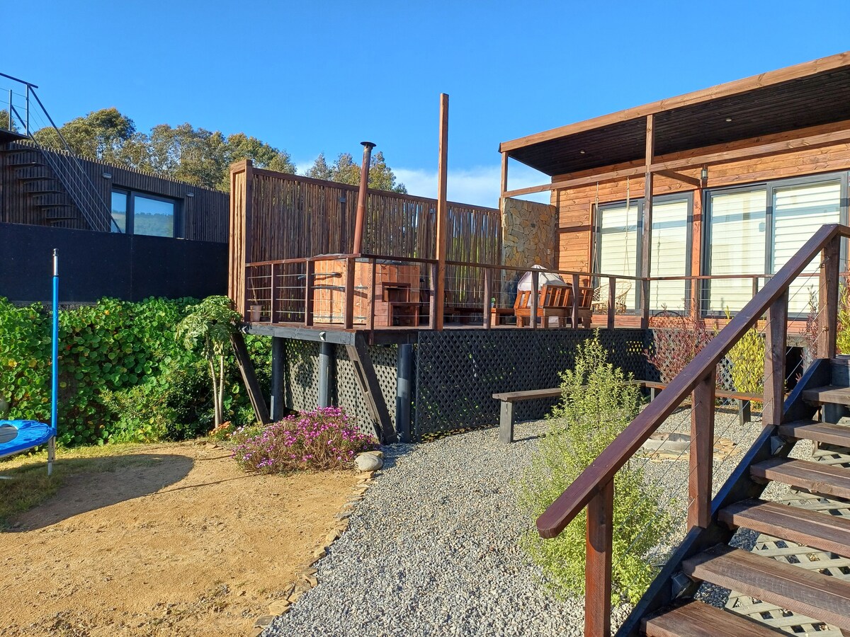 Trehytte med boblebad og Starlink, med utsikt over Cáhuil Lagoon og den opprinnelige skogen. Avsidesliggende for stillhet, men likevel nær strender, severdigheter, restauranter og butikker for alle nødvendigheter. Har solfylte terrasser, skaterampe, bålpanne og gass-/vedgrill. Fullt mobilsignal og raskt trådløst nettverk gjør det til det perfekte naturferiestedet.