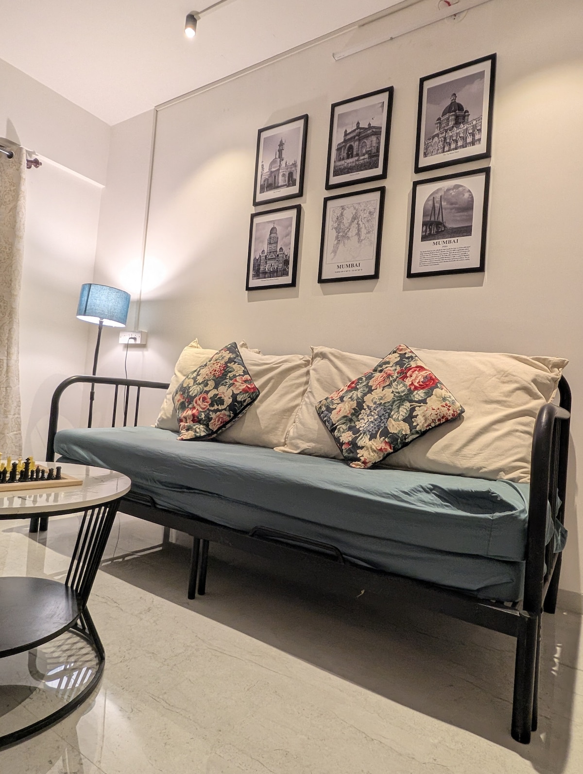 Den sjarmerende 2BHK-leiligheten vår ligger i hjertet av Bandras ikoniske Pali-nabolag, og tilbyr den perfekte blandingen av komfort, stil og beliggenhet. Våkne opp omgitt av summingen fra Mumbais mest trendy kafeer, håndverksbakerier og designerbutikker. Gå ut, og du er umiddelbart fordypet i den pulserende energien i Bandra West, men likevel bortgjemt i en fredelig gate som hvisker historiene om gamle Pali Village. Hjemmet vårt er et koselig, velutstyrt sted hvor urban chic møter vintage sjarm.