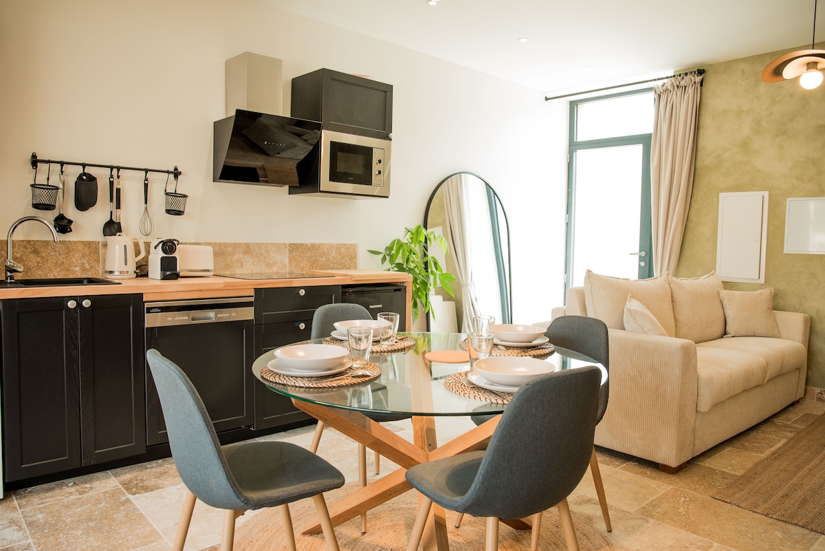 Vi vil ha gleden av å ønske deg velkommen til dette unike og rolige stedet, som ligger ved foten av festningsvollene, like ved sentrum og med tilgang til alle fasiliteter, i hjertet av turistområdet. Nylig restaurert og utstyrt med alle fasiliteter, inkludert en jacuzzi, kan du nyte et virkelig avslappende øyeblikk med en fantastisk utsikt over middelalderbyen Carcassonne. Kapasiteten er 4 personer. Reservasjon er mulig fra 2 personer.