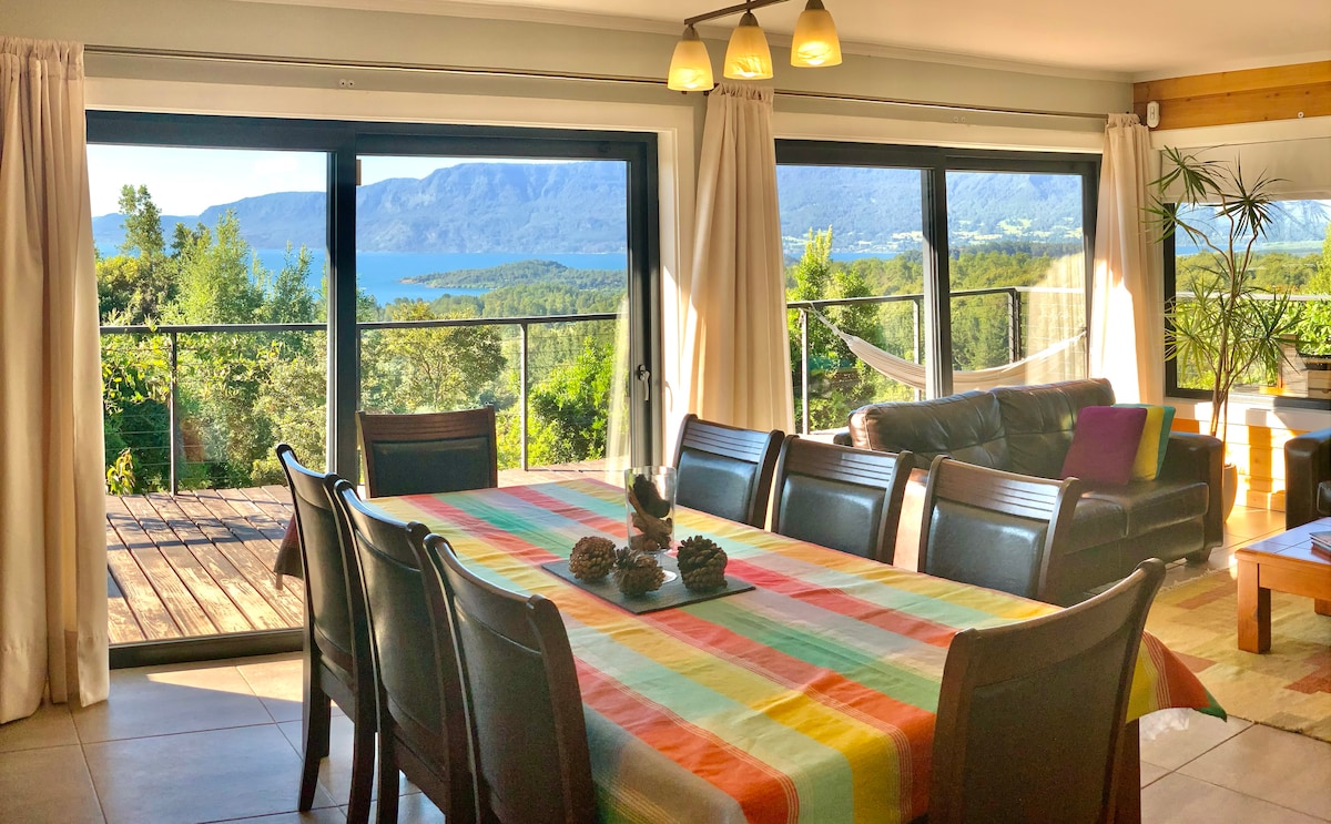 Romslig og komfortabelt hus 4 km fra Pucón, tre soverom med egne bad (super king-size-seng, king-size-seng, queen-size-seng og to enkeltsenger), ideelt for to familier. Fullt utstyrt kjøkken, oppvaskmaskin, pelletovn, Starlink-internett, kullgrill, og oppholdet inkluderer én gratis ettermiddag med friskt kildevann fra tinajaen. Plassert i en veldig rolig, trygg og privat sektor. Personlig døgnåpen kundeservice. Autonom inntekt.