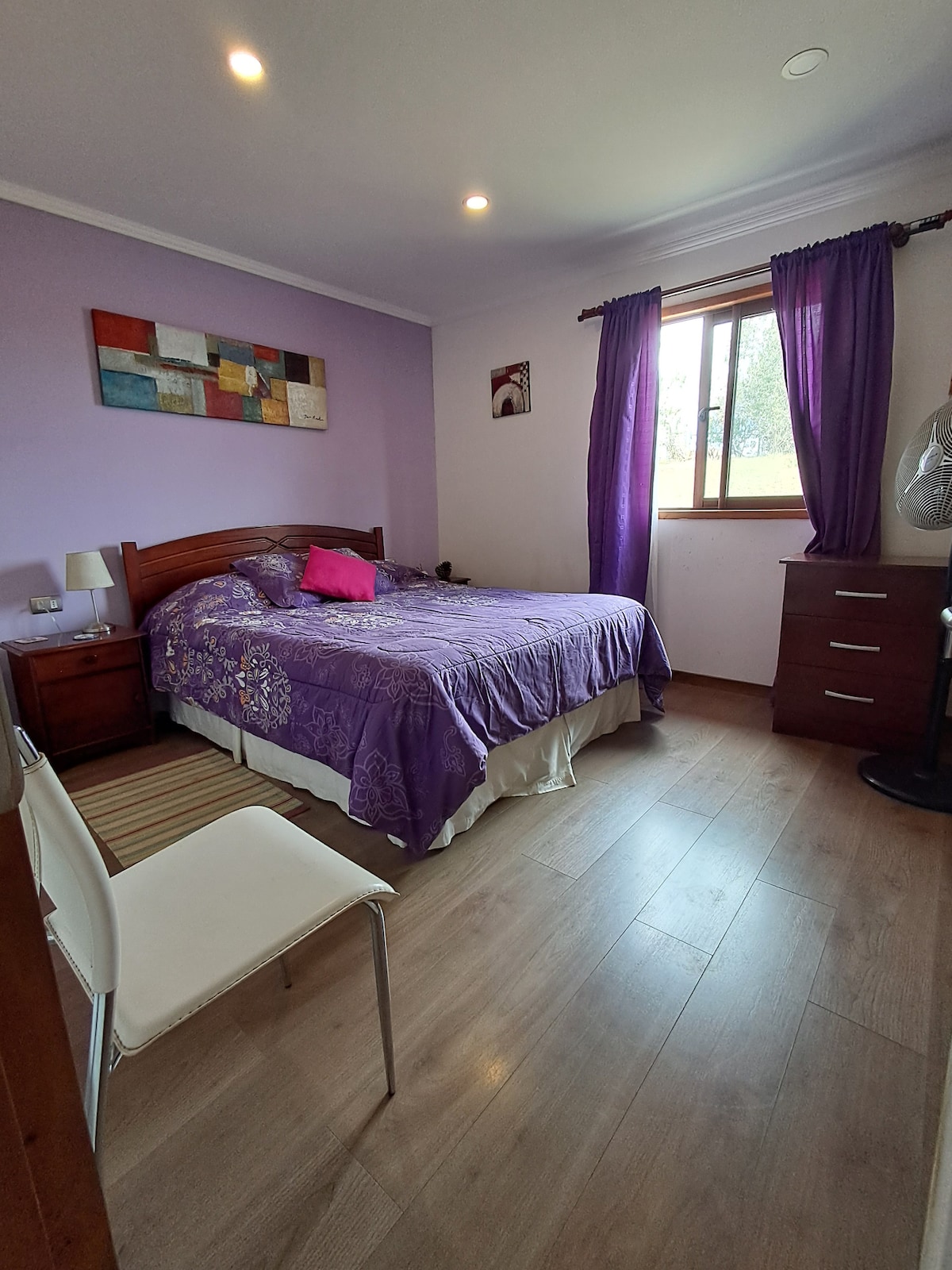 Nyt dette rolige og sentrale stedet. Et hjem dekorert med vakre detaljer, plassert i nærheten av innsjøen og kasinoet i Pucon. Med rikelig med parkering kan du gå rundt i landsbyen uten problemer. Terrassen din er stor, og barn kan leke trygt. Den har 3 soverom: 2 med 2 enkeltsenger, i tillegg til et dobbeltrom, et bad, fullt utstyrt kjøkken, spisestue og stue for 8 personer. Utendørsterrasse og grill. Tinaja har en ekstra verdi.