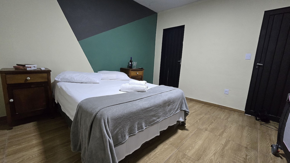 A Hospedaria São Pantaleão está localizada na região central de Espírito Santo do Pinhal, a apenas 3 minutos da Vinícola Guaspari e próxima ao centro da cidade. A área é cercada por restaurantes e cafés aconchegantes, perfeitos para quem deseja aproveitar a gastronomia local. O apartamento conta com uma cozinha completa equipada com utensílios, uma sala confortável e dois quartos: um com cama de casal e outro com duas camas de solteiro. É uma opção prática e acolhedora para sua estadia.