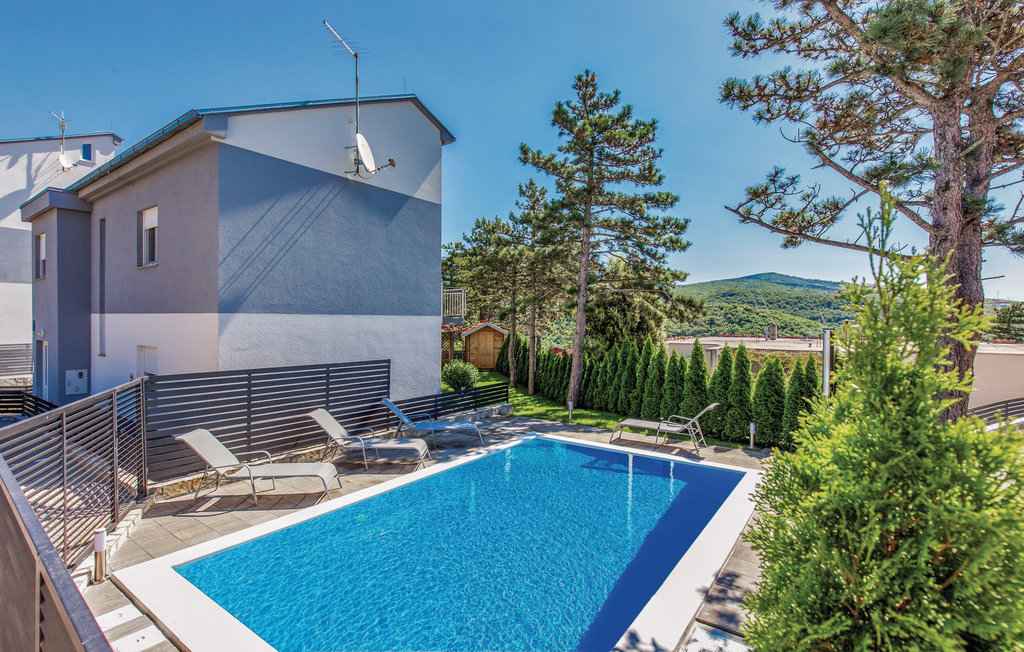 Escape to a private luxury villa surrounded by nature just 5 minutes from Crikvenica. Enjoy a heated pool, outdoor jacuzzi, wine corner and a peaceful garden. Perfect for families or friends looking for privacy near the Adriatic coast. With 4 bedrooms, the villa comfortably accommodates up to 8 guests. Outside, a private pool offers refreshment on hot days and can be heated on request for an additional fee. The sun-lounger area stays shaded most of the day and offers beautiful landscape views.