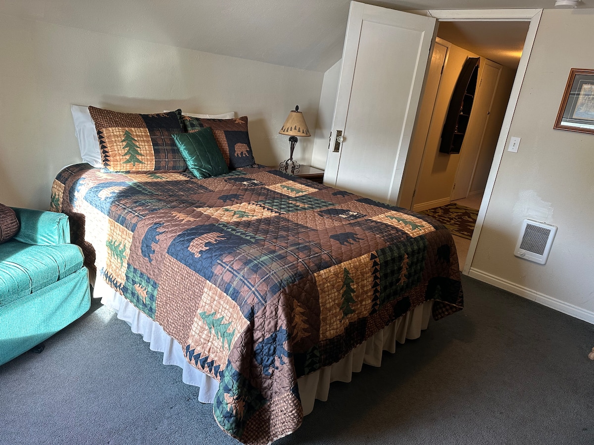 Velkommen til Burro Flats High Desert Lodge (hjemmet vårt som vi elsker å dele med gjester)! «Independence Room» er et stort (ca. 500 kvadratfot) hovedsoverom for opptil tre personer. Det er et rom i andre etasje med utsikt mot øst, og tilknyttet privat bad inkludert dypt badekar (pluss dusj). Den har også et stort klesskap, sitteplass og SUPER komfortabel queen size-seng. Våre flere gjester DELER tilgang til kjøkkenet i hovedetasjen, biljardbord (TV og biljardbord åpent kl. 10.00–22.00), toalett.