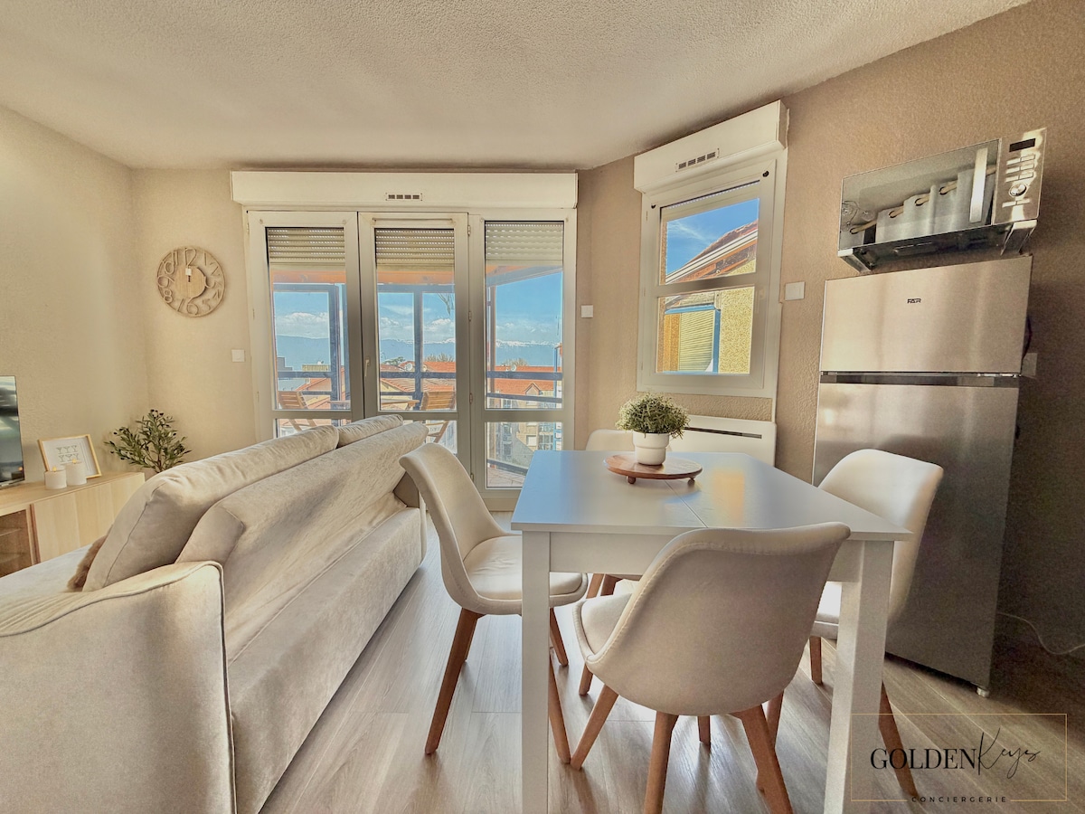 Kom og oppdag denne unike boligen på 70m2 mellom INNSJØER og FJELL, i en totalrenovert gård, med TERASSE med UNIK UTSIKT over FJELLENE, rolig og perfekt plassert 30 minutter fra den SVEITSISKE grensen. 🚗 GRATIS PARKERING på stedet 🧑🧑🧒🧒 Kapasitet: 5 personer. 📍Beliggenhet: I en rolig by nær Sveits, i hjertet av Haute Savoie ✈️ Tilgang til flyplassen: 35 minutter med bil ⛰️ Innsjøer og skianlegg mindre enn en times kjøretur unna Annecy mindre enn 30 minutter unna