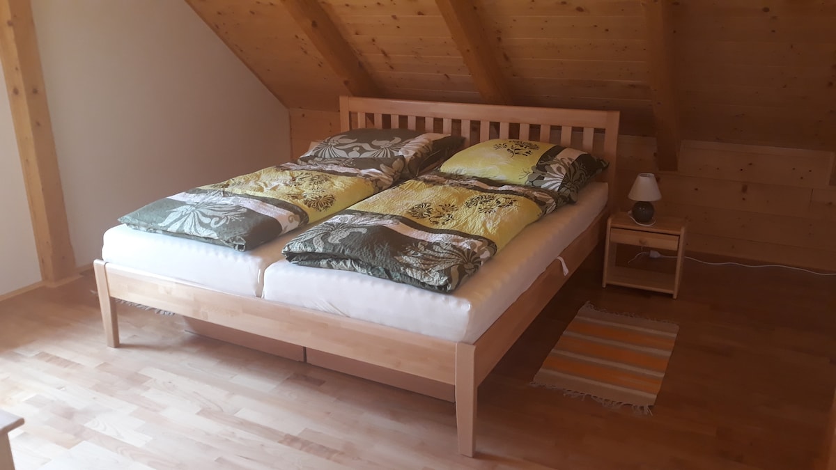 Toto jedinečné ubytování má svůj osobitý styl. Je zcela nové, podkrovní, útulné, s dřevěnými trámy i obložením, s designovou kuchyní a doplňky. Poloha je fantastická-jen 5 minut do centra, 8 minut k oblíbenému turistickému Zámku Dobříš, 1 minutu k rybníku a k nejbližšímu lesu cca 15 minut. Vhodné pro páry, rodiny, kamarády i cyklisty (možnost uschování kol). 3 pevná lůžka ( jedna manželská postel queen size, jedna samostatná). Pro každého hosta je připraven welcome drink.