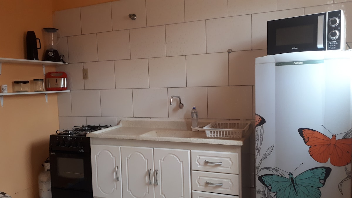 🏡 Casa godt plassert i Bairro Morada dos Pássaros II, ved siden av Shopping Conquista Sul i en rolig og trygg offentlig gate. Stedet har et komplett kjøkken med mikrobølgeovn, elektrisk stekeovn, blender, luftkoker, komfyr, kjøleskap og grunnleggende redskaper for hverdagen. Den har 3 soverom, med 1 suite med queensize-seng, andre med en dobbeltseng og en enkeltseng. Sofa, TV, trådløst nettverk, vifte og hårføner. Den har en garasje for én liten bil, en elektronisk port og en nøkkelboks for innsjekking/utsjekking.