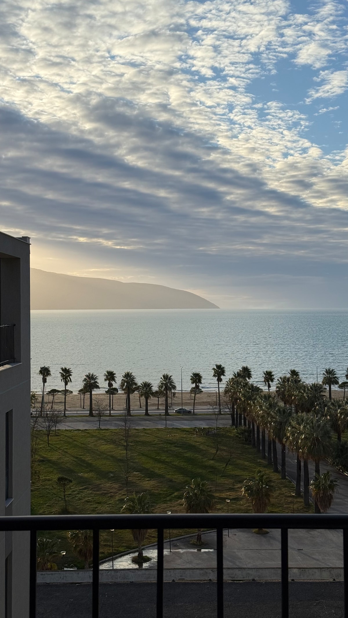Våkn opp til lyden av bølger og panoramautsikt over havet fra en stor privat balkong! Denne stilige leiligheten med to soverom og to bad på Vloras hovedpromenade tilbyr Netflix, klimaanlegg, sovesofa, heis og betalt privat parkering. Bare noen skritt fra stranden, restauranter og det livlige arrangementstorget – perfekt for et uforglemmelig opphold i Vlora!