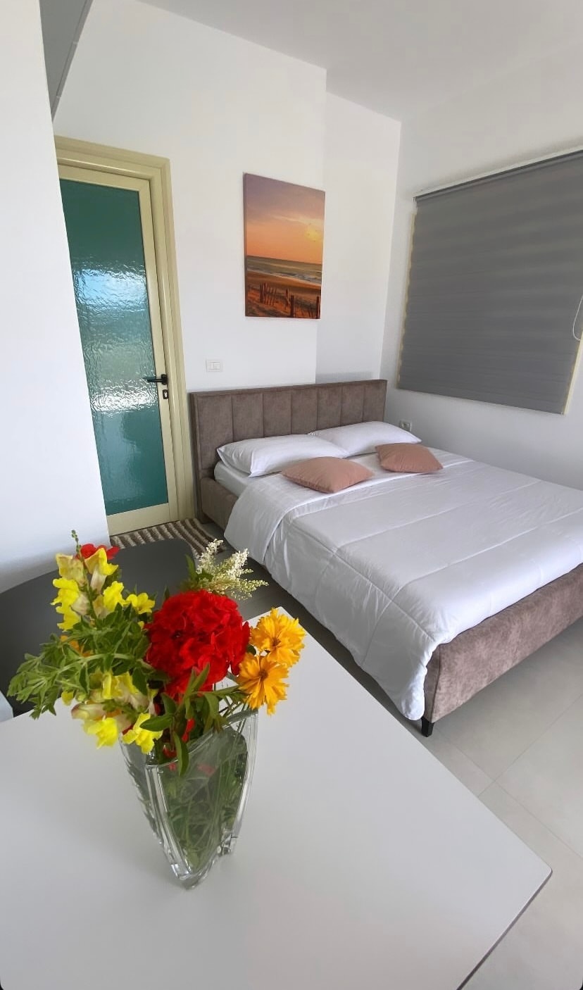 Gratis parkering ved bygningkomplekset Balkong med utsikt over hovedgaten og fjellet Koselig seng med sengetøy i hotellstil for par Raskt trådløst nettverk og smart-TV for streaming eller arbeid Aircondition, vaskemaskin og tørketrommel Fullt utstyrt kjøkken for enkle måltider. Innsjekking uten vert for fleksibel ankomst Utforsk Lungomare, stranden og kaféene bare trinn unna