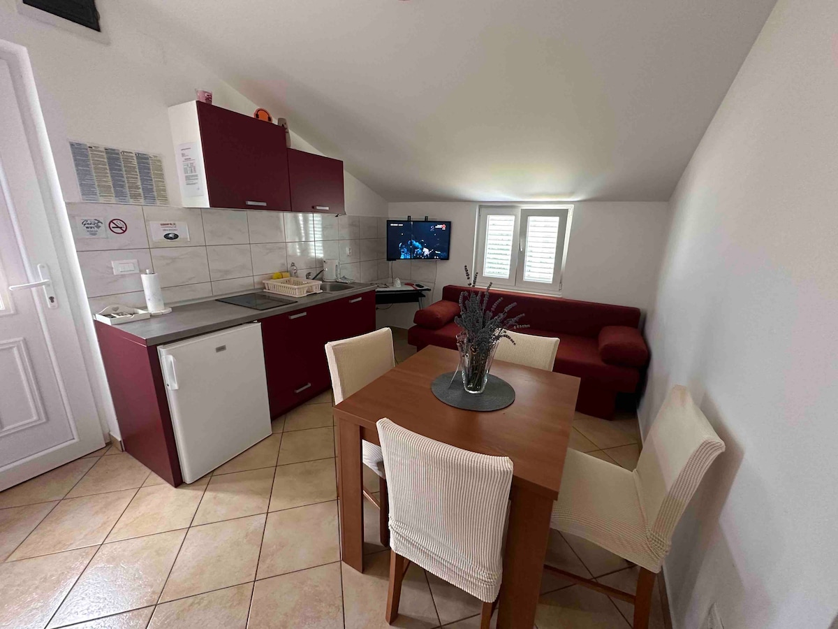 Leiligheten Mia ligger 3 km fra Np Krka, Lozovac, og tilbyr et rolig opphold for to voksne eller to voksne og to barn. Det inkluderer et soverom, stue med sovesofa, kjøkken, bad, terrasse, gratis Wi-Fi, gratis parkering og felles basseng (åpent 1,6.-30,9.). Perfekt for familier og naturelskere. Bil er nødvendig. Butikker og restauranter (Golub) ligger i nærheten, bare én km fra oss. Vi anbefaler å besøke Šibenik, Skradin og Solaris Aqua Park under oppholdet. Utforsk også vakre strender i området.
