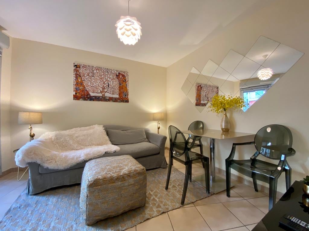 Beliggende i hjertet av byen, 180 m fra sjøen og Promenade des Anglais. Nær butikker. 2 rom på 50 m2, rolig sted, totalrenovert i 2022, maks 4 personer, rolig og solrikt sørvestlig, ligger i Rue de France boulevard François Grosso, nær Mariott-hotellet. Ligger 100 m fra trikk- og bussholdeplassen. Uhindret utsikt, 2 balkonger. Siste 5. etasje, all komfort, nye apparater, 2 reverserbare klimaanlegg (varme), wifi, 2 TV-er. Nyere bygning.