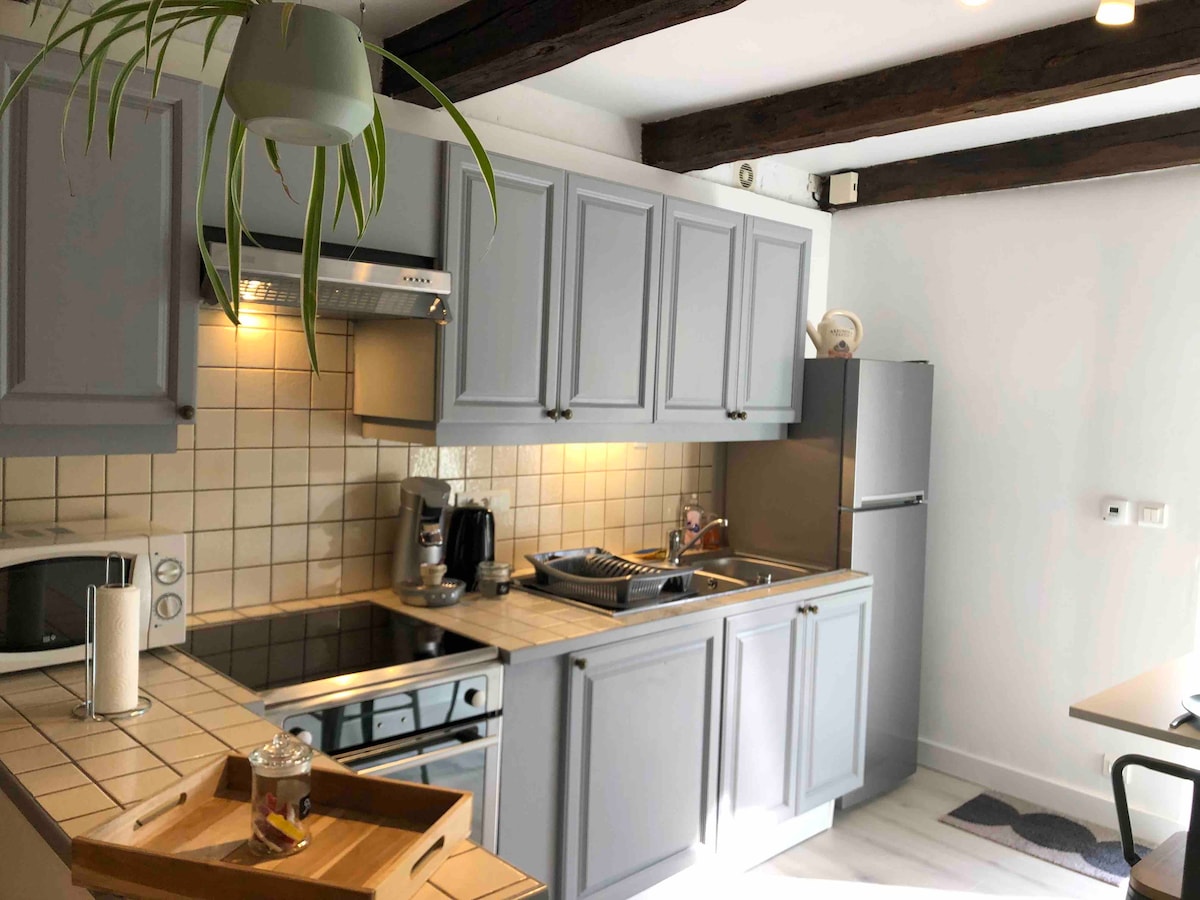 Ny studioleilighet på 20 m² i én etasje med terrasse, beliggende i et «Cité de Caractère» (historisk distrikt). Vurdert til *** av Gîtes de France. Helt privat og avsidesliggende overnattingssted. Perfekt for å slappe av i et rolig og grønt miljø, beliggende i hjertet av Haute-Saône mellom Vesoul og Besançon. Ideelt for et par eller en person på jobbreise. Fullt utstyrt kjøkken: mikrobølgeovn, komfyr, kaffemaskin + kaffekapsler, bestikk og kjøkkenutstyr, krydder og tilbehør. Baderom med dusj.