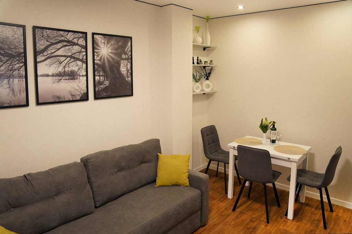 Lyst og moderne studio med et areal på 35 kvm som ligger i et rolig område av byen i gangavstand fra transportknutepunkter. Det romslige rommet kombinerer et sitteområde med en komfortabel sofa, et utstyrt kjøkken med moderne apparater, inkludert kjøleskap, platetopp og mikrobølgeovn. Bad med dusjkabinett er laget i moderne stil. Leiligheten har trådløst nettverk, TV og klimaanlegg for et komfortabelt opphold. Det er gangavstand til kafeer, butikker og parker.