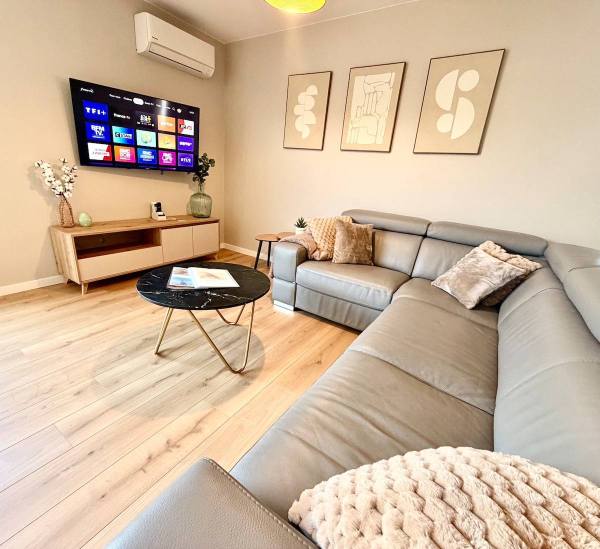 Adopter kokong-holdningen I hjertet av Sommebukten – veldig vakker, autentisk, varm og designert leilighet. Vi sørger for sengetøy og håndklær. Ekstra 50 euro for ett kjæledyr. Sørg for å oppgi det. Denne fullt restaurerte hytta på 120 KVM tilbyr vakre volumer, samt panoramautsikt over bukten med hvor selene befinner seg. Ligger ved foten av butikker og torget, alt du trenger å gjøre er å sette ned bilen og gå rundt.