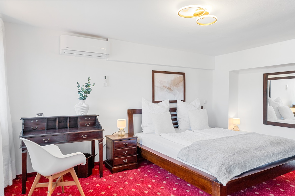 Det nye og moderne rommet ligger i annekset og har en romslig dobbeltseng, en stor TV med sofa og to lenestoler, samt et separat bad med badekar. Rommet har gardiner. For den tredje gjesten finnes det en sammenleggbar seng som et sovealternativ.