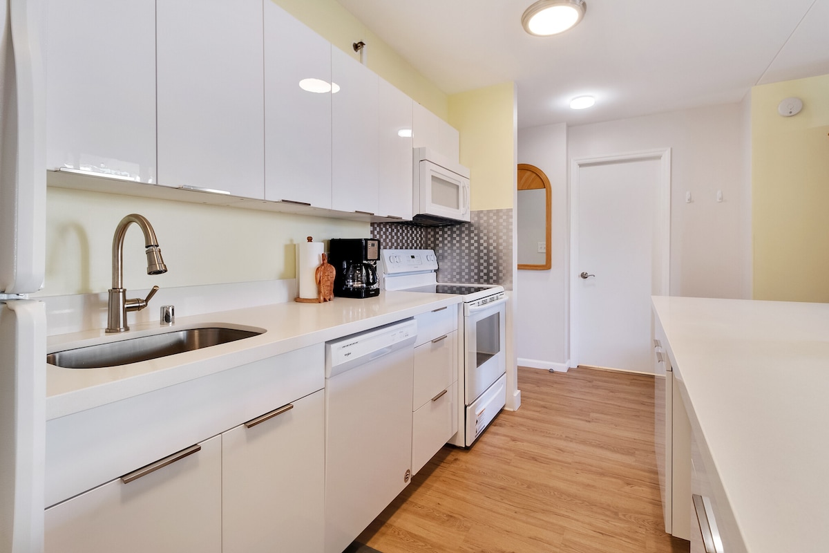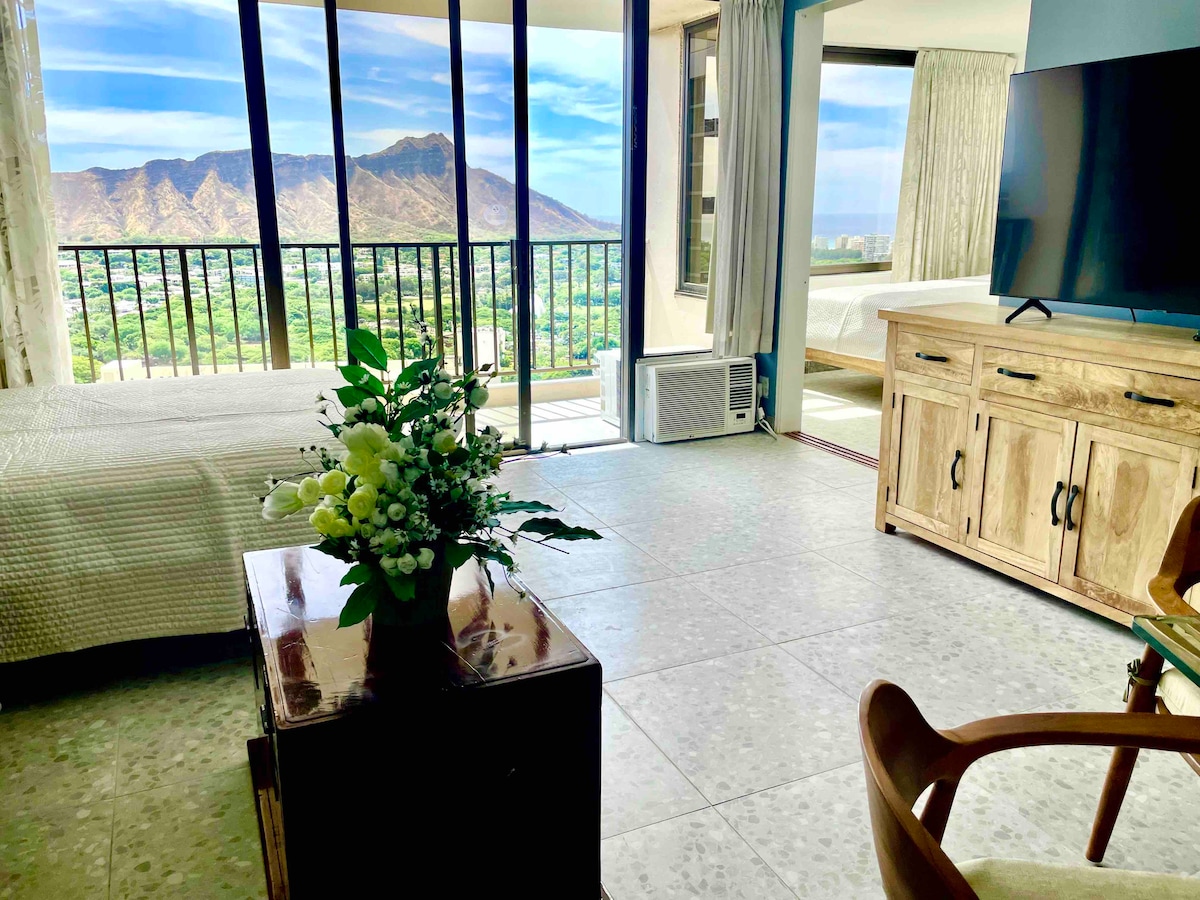 *Vi prioriterer renhold! Vi inspiserer og rengjør enheten på nytt, og vasker sengetøy personlig uten sterke kjemikalier.* Velkommen til leiligheten vår med ett soverom i hjertet av Waikiki, bare noen få skritt unna den berømte Waikiki Beach! Har fullt utstyrt kjøkken, uttrekkbar sovesofa, privat veranda med utsikt over byen og fjellet, og gratis trådløst nettverk og parkering. Nyt fasiliteter som bassenget, boblebadet, grillen og saunaen! Kort spasertur til butikker, restauranter og underholdningsmuligheter. Kom og nyt et minneverdig opphold i paradis!