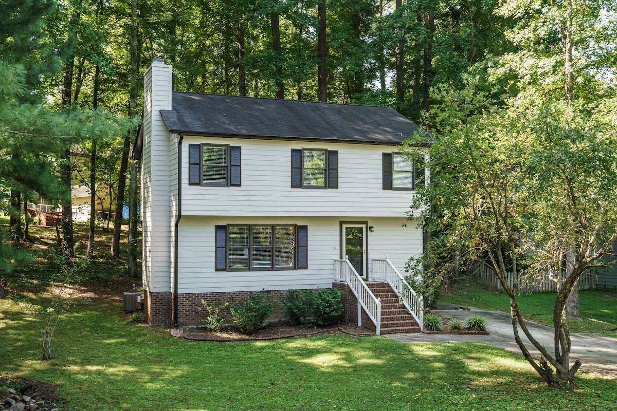 Velkommen til Fox Hollow, et stilig og komfortabelt tilfluktssted på to fredelige hektar. Praktisk til både Raleigh og Durham, men bortgjemt i et rolig skogsområde, vil du oppleve det beste fra to verdener. Gjester i alle aldre vil nyte rekreasjonsområdet med bordtennis, fotball og mer. Enten du planlegger en lang ferie eller en kort ferie, vil det private spaet og det innebygde ildstedet gjøre oppholdet ditt minneverdig, og det fullt utstyrte kjøkkenet og de komfortable sengene får deg til å føle deg som hjemme.
