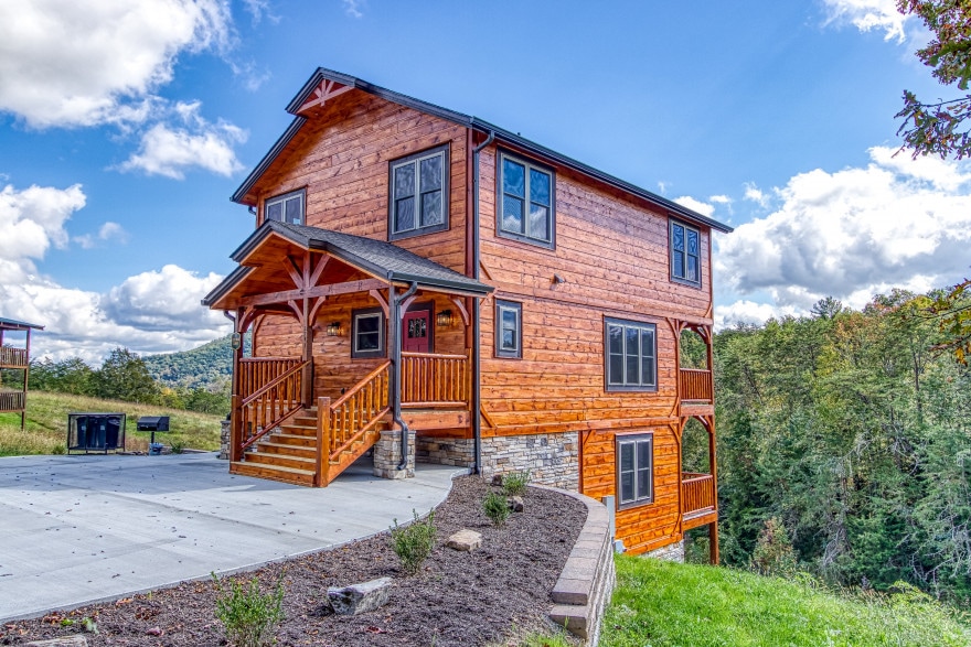 IKKE GÅ GLIPP AV NOE! Bygget i 2022! Unik garasjestil! Nydelig Bluff Mountain Views og BARE fem minutters kjøring til hovedgaten Parkway! Svært romslig hytte for seks personer. Kingsize-seng på soverommet i hovedetasjen. To uttrekkssenger på loftet. Ett romslig bad i hovedetasjen. Fullt utstyrt kjøkken (gryter, panner, tallerkener, sloe-koker, Keurig-kaffemaskin osv.) Ta med hele familien til dette flotte stedet med mye plass til moro.