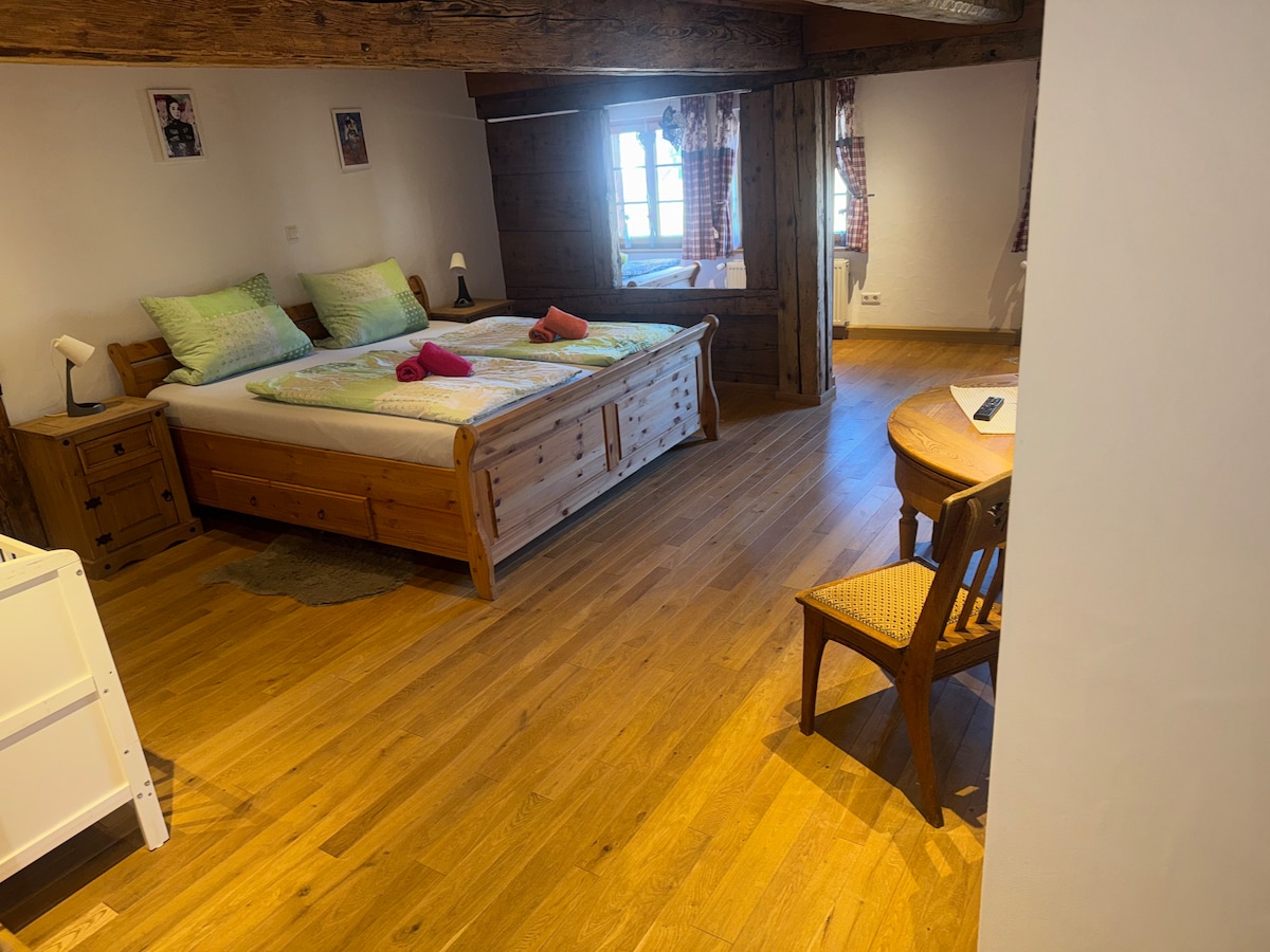 Du vil føle deg komfortabel i leiligheten Alpenblick. Du kan forvente en fullt møblert, romslig leilighet for opptil 4 personer (2 personer på en sovesofa). Gamle treelementer som minner om husets lange historie, skaper en koselig atmosfære, og den vakre utsikten over enger, beitemarker og skoger inviterer deg til å slappe av på den overbygde balkongen. Leiligheten er ca. 55 kvadratmeter.