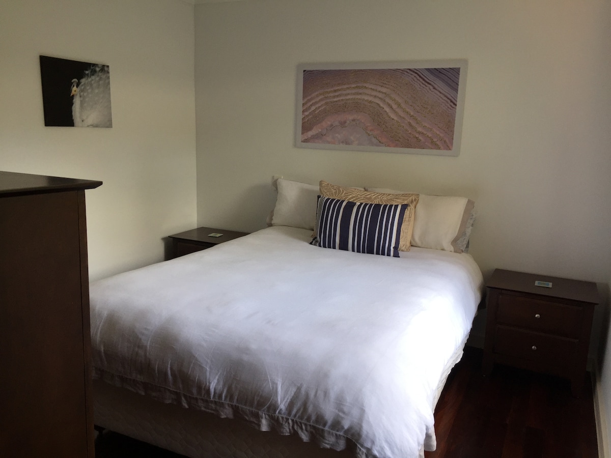 Silver Gypsy Flat adjoins our home. Key entry, secure steel window & door screens, a/c, table, chairs, pantry, induction cooktop, mini-oven, sandwich maker, frypan, kettle, toaster, pod coffee maker, juicer, glass oven, microwave, rice cooker, fridge/freezer, china, cutlery & glasses. Sofa bed, new 50" tv, lamps, queen bed, desk, chaise lounge, walk-in robe & ensuite, pillows, quilts & linen. Private garden, BBQ, patio table, chairs, brolly & free offroad parking. Late arrivals' Key Lock.