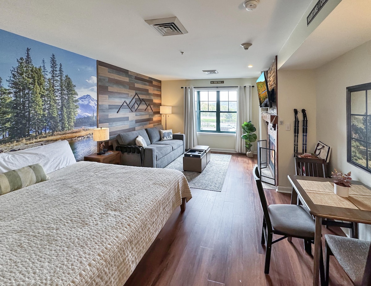 Luksuriøs loftsstudio med heis og parkering rett på Main St – hjemsted for Applefest, vingårder og bondemarkeder. Gå til alle de flotte restaurantene og butikkene. Skigåing i nærheten! Dampdusj, justerbar seng med massasje. Designerkjøkken, Kardiel-fløyelssofa/sovesofa, elektrisk peis, 60 tommers HD smart-TV. Koselig vindusplass med utsikt, perfekt til morgenkaffen! Keurig, kaffe, te og vann på flaske er tilgjengelig. Slapp av og nyt - overlat rengjøringen til oss ved utsjekking!