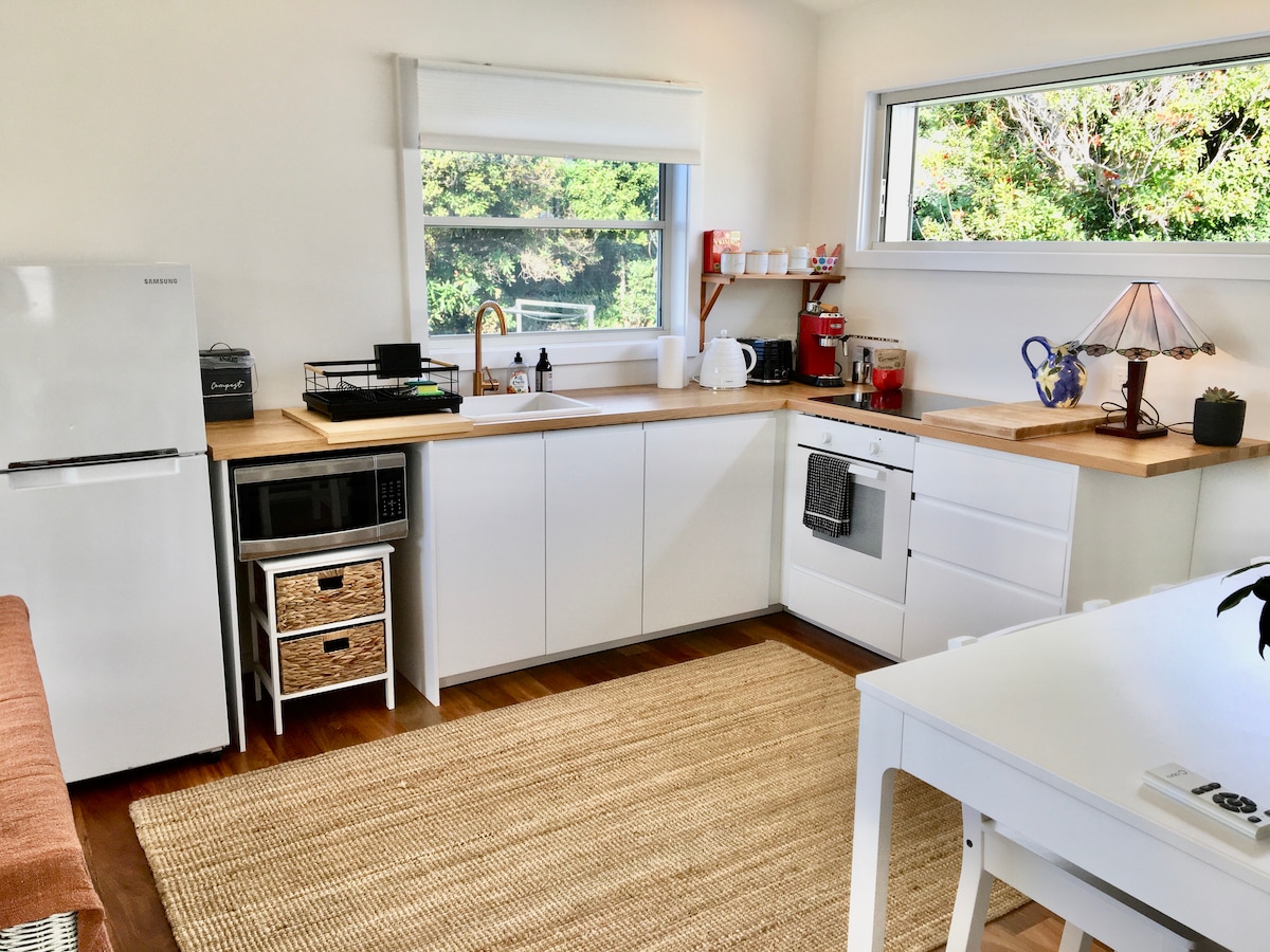 Ankom gjennom antikke porter, og vandre nedover gangveien dekket av blåregn til ditt hjem hjemmefra. Utendørs flislagt underdekket område med spise-/stueområde, opplyst om kvelden med silkelanterner, inviterer deg ut for en spesiell anledning. Lysfylt hytte, åpen planløsning stue/spiseplass. Soverommet har en myk queen-seng for en lykkelig natts søvn. Badet inviterer til nytelse med en regnskogdusj. Fullt utstyrt kjøkken med vaskemaskin. Gjennomtenkte detaljer overalt.