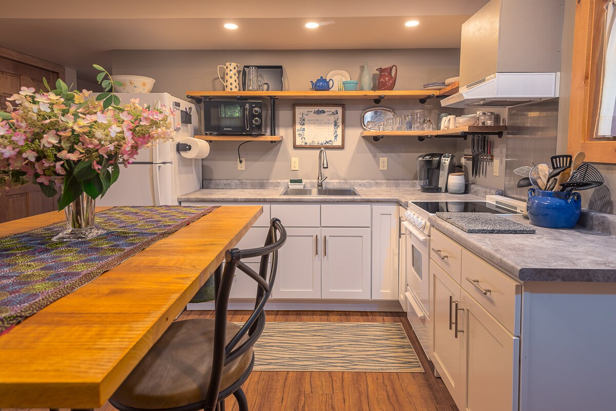 ***SISTE LITEN-TILGJENGELIGHET – 13.–16. februar!*** Stor nyrenovert leilighet med to soverom og to bad i et privat, avsidesliggende hjem. Perfekt for skiferier🎿❄️! – 1,6 km til Stowe Resort 🏔️ – 2 miles fra Alchemist og Upper Mtn Road restauranter og butikker Supermyke senger, raskt trådløst nettverk og TV for koselige netter i. Kjøkkenet har alt utstyr til måltider. Romslige skap. Perfekt for par, venner eller familier med separate soverom og eget bad.