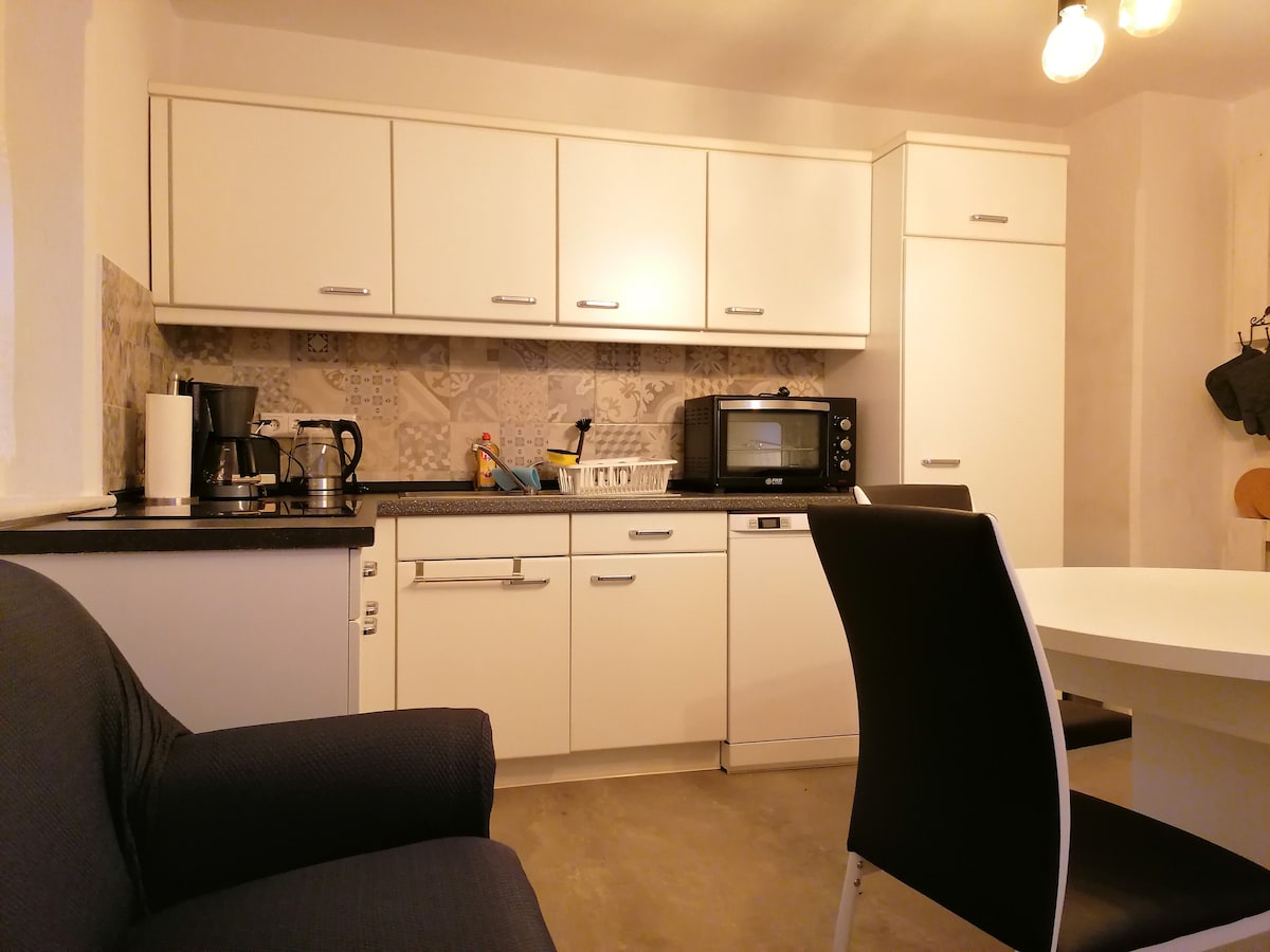 - rolig, men sentralt til riktig nær restauranter og butikker, inngang uten trinn, 2 komfortable senger, 2 enkle ekstra senger, barneseng, stort kjøkken med oppvaskmaskin, vaskemaskin, gulvvarme, romslige størrelser! Ideelt for syklister, skatere, familier (med barn) og pelskledde venner (kjæledyr). Røyking forbudt i huset, men det er en stor terrasse. Sykkel til felles bruk på egen risiko, parkering på den inngjerdede 900 m2 eiendommen