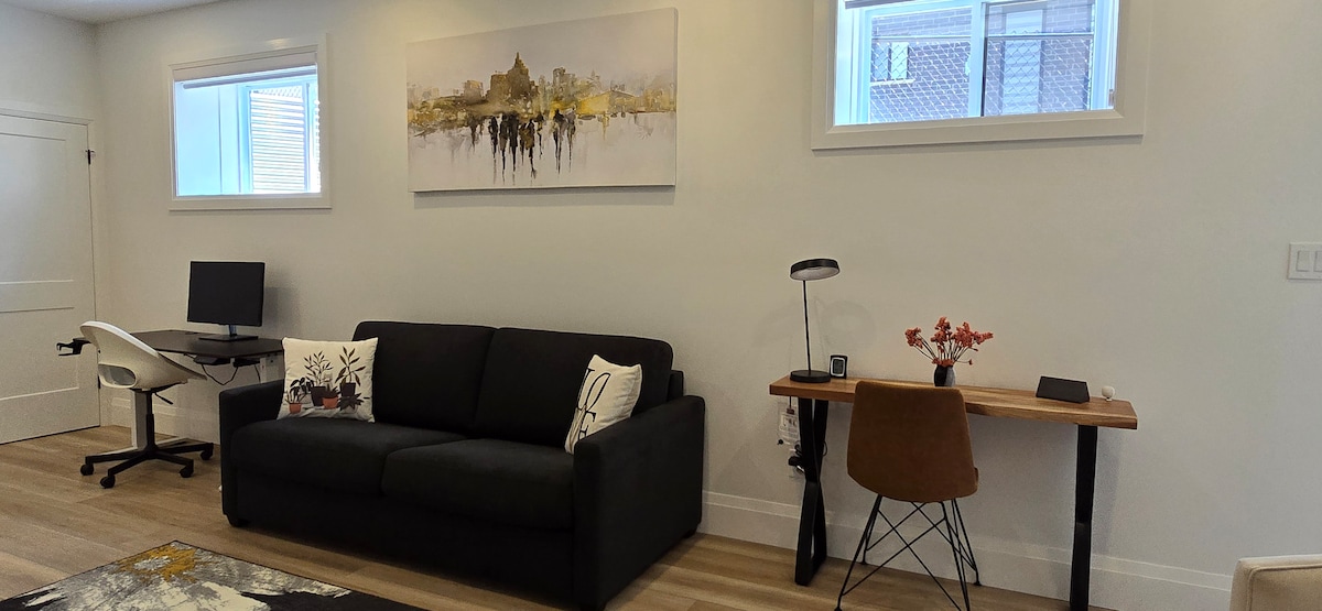 Dette nybygde, fullt møblerte gjestestudioet er både romslig og lyst, med egen inngang og private vaskerom. Bare fem minutters kjøretur til dagligvarebutikker, University of Guelph, turstier, parker og Stone Road Mall, og kun ti minutter fra det pulserende Guelph sentrum. Nyt trådløst nettverk med høy hastighet, en smart-TV med ulike strømmetjenester, gratis kaffe, te og snacks, pluss en praktisk parkeringsplass. Verten er dedikert til å sikre et komfortabelt opphold.