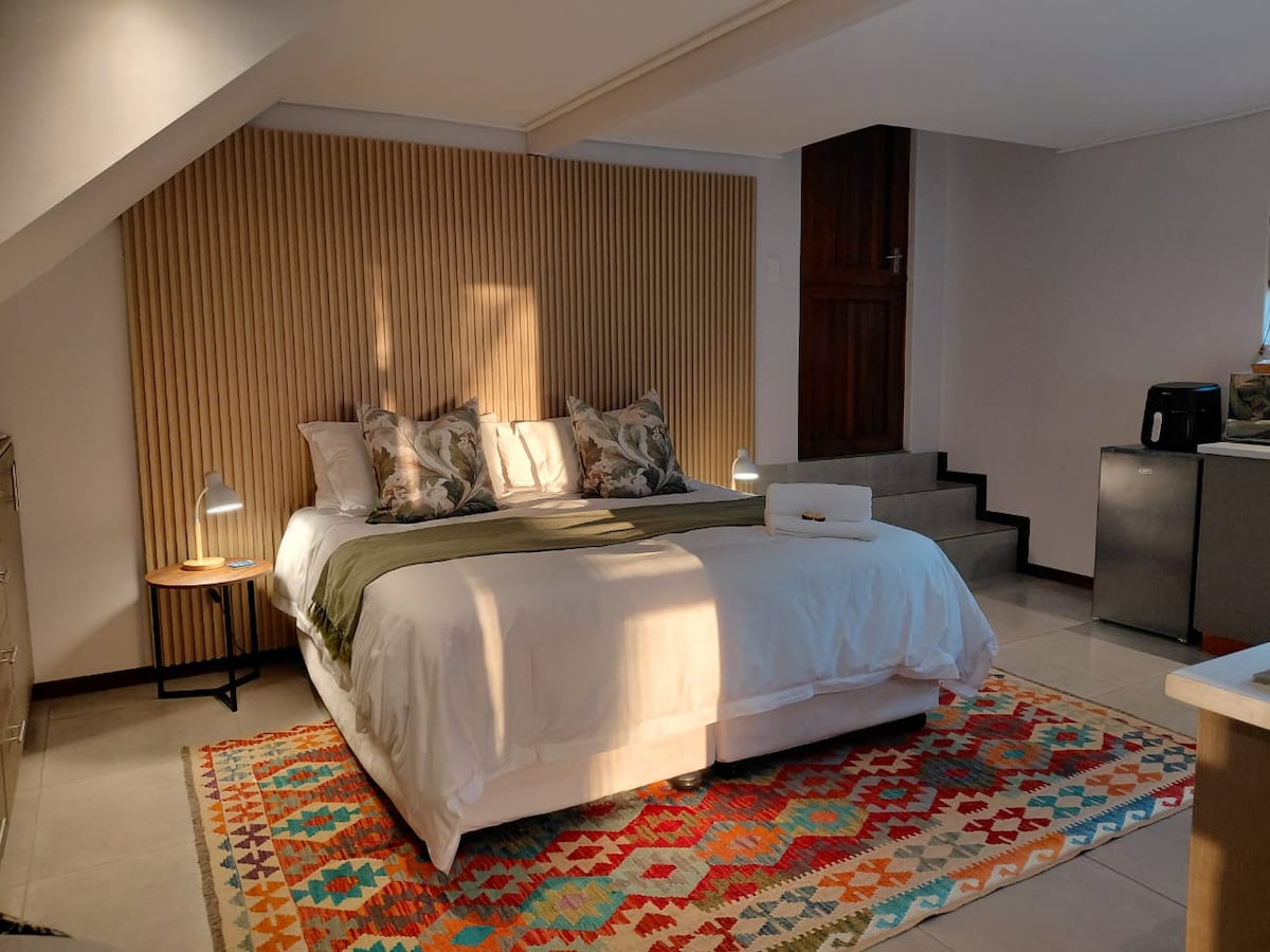 Studioleiligheten vår åpner seg mot en 40 kvadratmeter stor balkong med panoramautsikt over Hout Bay-dalen og Helderberg-fjellene bak. Store skyvedører forsvinner inn i veggene og skaper en uhindret flyt mellom innendørs og utendørs, mens den forhøyede posisjonen beskytter privatlivet ditt. Badet med åpen planløsning vender mot en lukket hemmelig hage som inkluderer en rammeløs glassdusj. Enheten har et fullt utstyrt tekjøkken og betjenes daglig unntatt i helger og på helligdager.