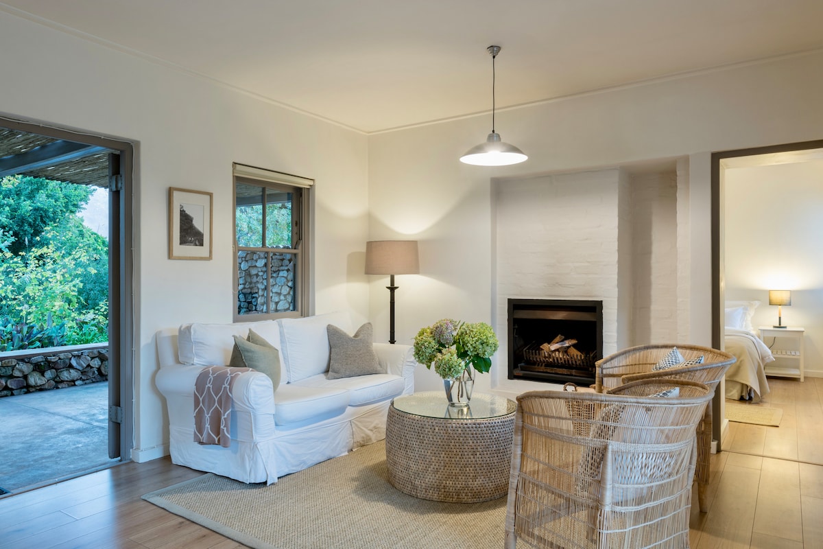 Selvbetjent enhet for fire gjester med BACK UP-STRØM, Amour ligger i Banhoek-dalen på en gård, 7 km utenfor Stellenbosch og er omgitt av fjell. Ideelt for par med barn, alenereisende og forretningsreisende. Du må bestille Amour (venstre seksjon) som sover to par eller en familie med barn som er helt privat. Trådløst nettverk med TV-strømming . Begge rommene har skrivebord. Koselig sitteplass med peis nede. Kom og opplev et luksuriøst liv på landet.